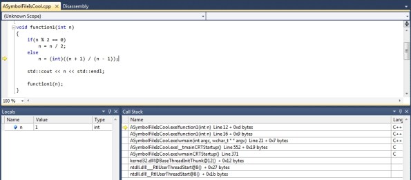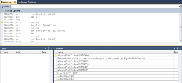 I wrote a very simple and dumb program in C++, whose main feature is to trigger a division by zero exception. Here is my debugger view (Visual Studio 2010) without symbols: