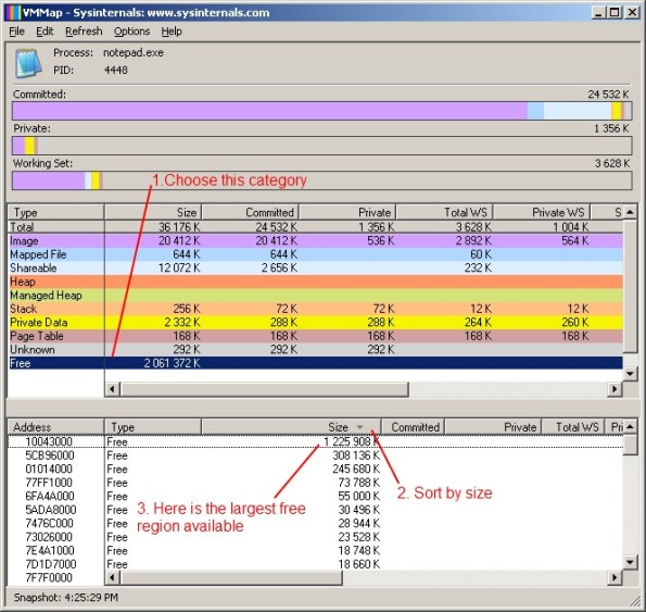 VMMap is a very useful tool made by SysInternals (and guess what, the guy behind this is…Mark Russinovich) that you can freely download here. The basic purpose is to give you a summarized view of each type of memory inside a process. By selecting the “Free” memory type, you can sort the region by size and have an idea of your largest free region :