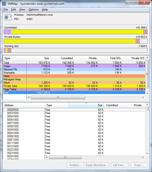First I do the maximum number of call to ‘VirtualAlloc’, then the same thing to ‘new’. At the end of the program, on my computer, I have a sum of 167 040 bytes allocated bytes. Here is what VMMap displays :