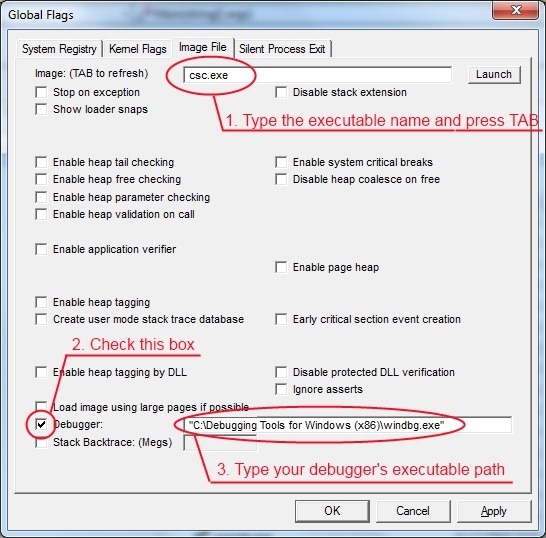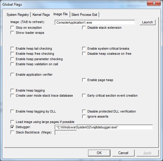 The idea is pretty much the same than in the previous chapter: use GFlags and type your debugger’s name. There is just one little trick: you cannot use directly Visual Studio to attach to a process with a command line. Instead, you may use VSJitDebugger.exe that you can usually find in the path %windir%\System32 of a computer where Visual Studio is installed (at least with the 2010 version):
