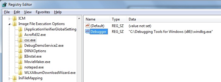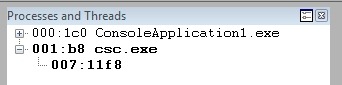 I deliberately typed ‘ConsoleApplication1.exe’ instead of ‘csc.exe’ in the previous example because the Visual Studio debugger uses csc.exe also, and debugging csc.exe like this would lead to a funny kind of infinite debugging loop (and eventually crash your system).