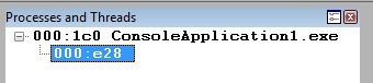 In this mode of debugging, I advise you to use the WinDbg window called ‘Processes and Threads’ (display it with Alt+9 or menu View->Processes and Threads) as it will display in bold the current process being debugged, with its name and its PID. To show you the result, I just made a simple .NET application using a XmlSerializer, so I expect my application to launch a .NET compiler to create the serialization assembly. Here is some views of the Processes and Threads window as time goes by: